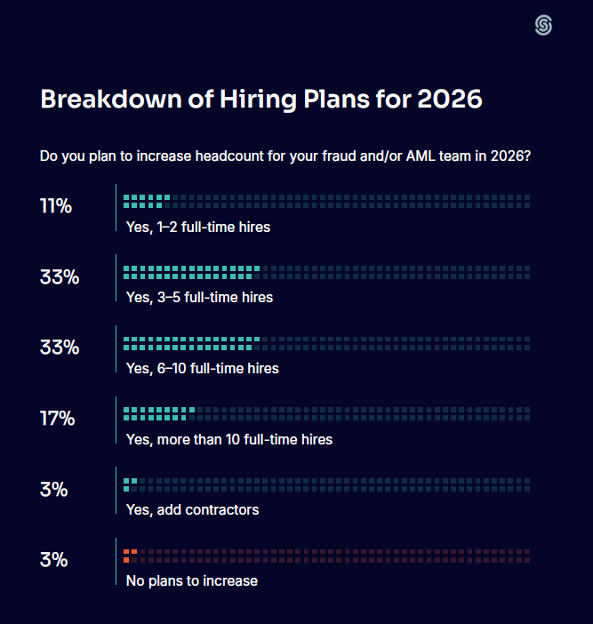 - 94% of leaders plan to add at least one full-time fraud or AML professional in 2026, up from 88% the previous year